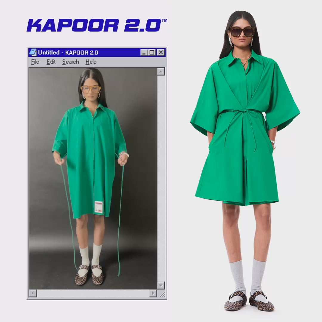 Relaxed fit dress in green cotton with tie-up cinch detail at waist.