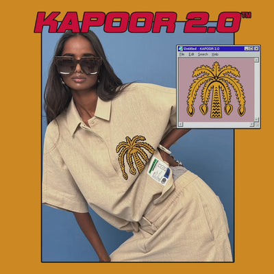 Half-sleeve oversized linen-blend shirt, finished with a handcrafted embroidery patch. Paired with wide-leg pants, elasticated at waist.